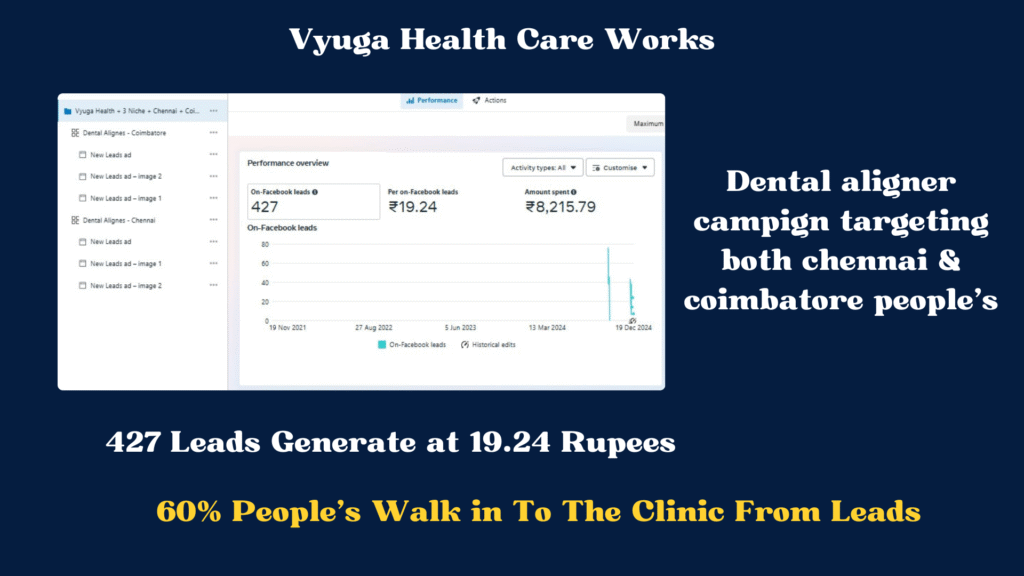 I ran targeted dental aligner campaigns for Vyuga Health Care, focusing on both Chennai and Coimbatore audiences. The campaigns generated 427 high-quality leads at just ₹19.24 per lead, with a strong 60% walk-in conversion rate from the leads to actual clinic visits. This strategy not only minimized acquisition costs but also ensured consistent patient flow and revenue growth for the clinic.