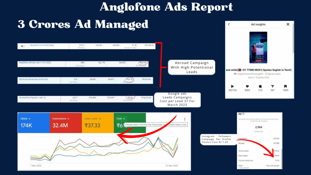 I managed ₹3 Crores worth of ads for Anglofone Online English, driving large-scale results across Google Ads, Meta Ads, and Instagram campaigns. With my performance-driven strategies, we achieved 174K clicks, 32.4M impressions, and leads at just ₹37 CPL. Abroad-focused campaigns delivered high-potential leads, while Instagram growth campaigns achieved profile visits at only ₹1.29, rapidly scaling brand credibility. These efforts played a key role in helping Anglofone 10× their profits and expand into a PAN-India brand.