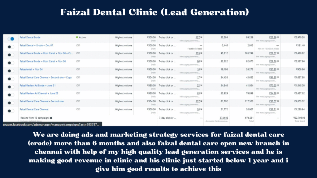 We are running ads and Google My Business marketing strategies for Faizal Dental Care, which has now grown to become the No.1 Dental Clinic in Erode. Through our high-quality lead generation approach, the clinic continues to achieve consistent patient inflow and strong revenue growth.